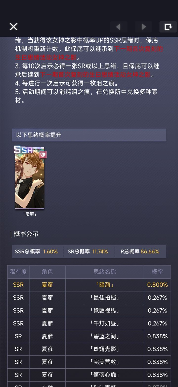 首先刚入坑,很喜欢这个游戏,玩过很多乙游是我最喜欢的了,每个事件故事都很用心。但是这个爆率我在思考我是否是一个新手,保底30ssr,附加80抽几乎全都是保底sr😇这是我玩过最黑的乙游