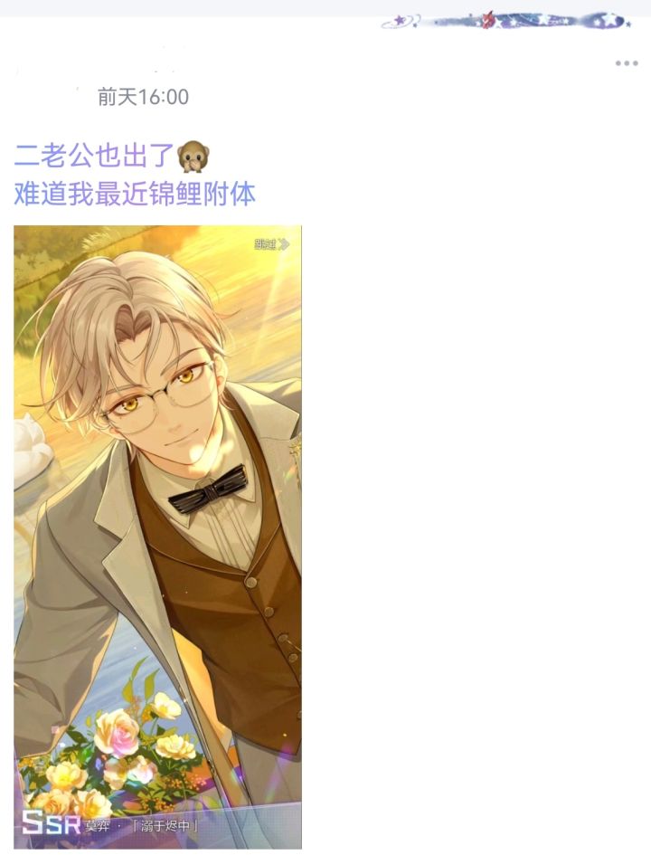 关于我单发出SSR这件事好不容易回归 打算在新活动里面抽抽卡,结果抽了20次就只有一张sr,还想再抽但是我的余额貌似不允许了😭😭就只剩下几个,本来是想屯着等以后再抽的,然后我弟在一旁使劲鼓励我 叫我试试单抽 或许就有一个ssr了呢于是我就决定了——我要单发出ssr!还口出狂言说如果这都能抽到我磕十个头!然后……还真就抽到了😵😵真的就给我出ssr了 我还不敢相信😳😳这下子 我是该说我欧呢还是该说我非呢(因为抽了这么多次卡一共就只有两张SSR!!!)
