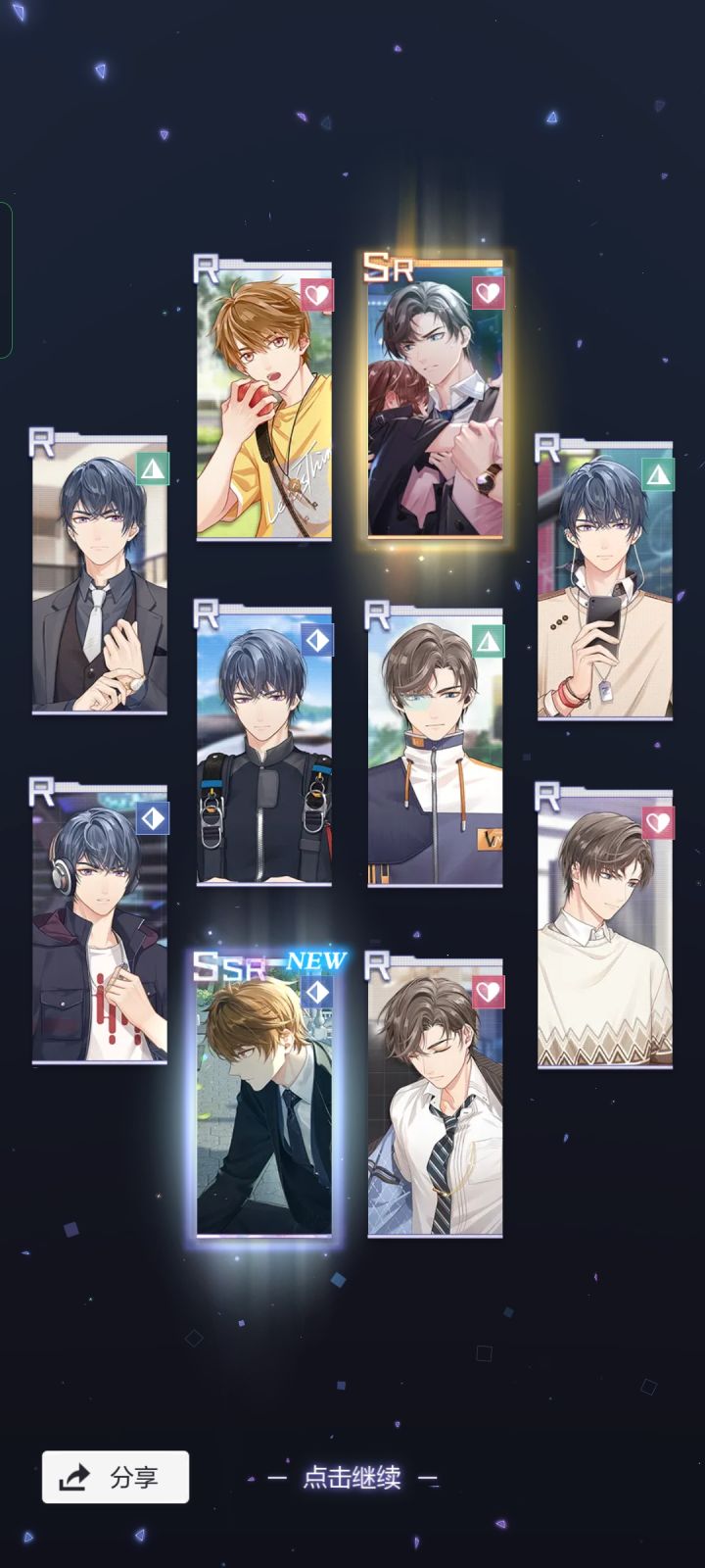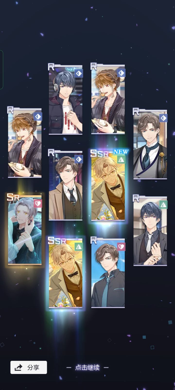 今天太欧了!!!!我的天!!50抽5个ssr!!杀疯了!左然的因为太激动忘记截图了😂结婚卡已经all in 了!突然觉得今天还是比较顺的,早上骑车上班,一路绿灯,给电动自行车充电,充电桩就剩一个位置了,我充上了,难道今天是我的lucky day?!