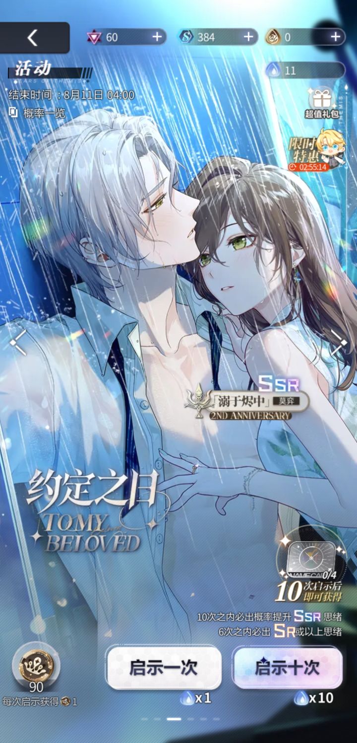 我真的大哭😭😭😭现在我官服进不去,就进了渠道服大号上 结果我去抽卡没有看池是谁的(我以为是混池和光夜一样😭😭)抽了三十抽抽尽了我的资产抽的小夏的抽到了婚卡两次😭😭😭抽完我才发现我抽错了😭😭😭我是不是和莫弈无缘了😭😭😭真的很崩溃😭