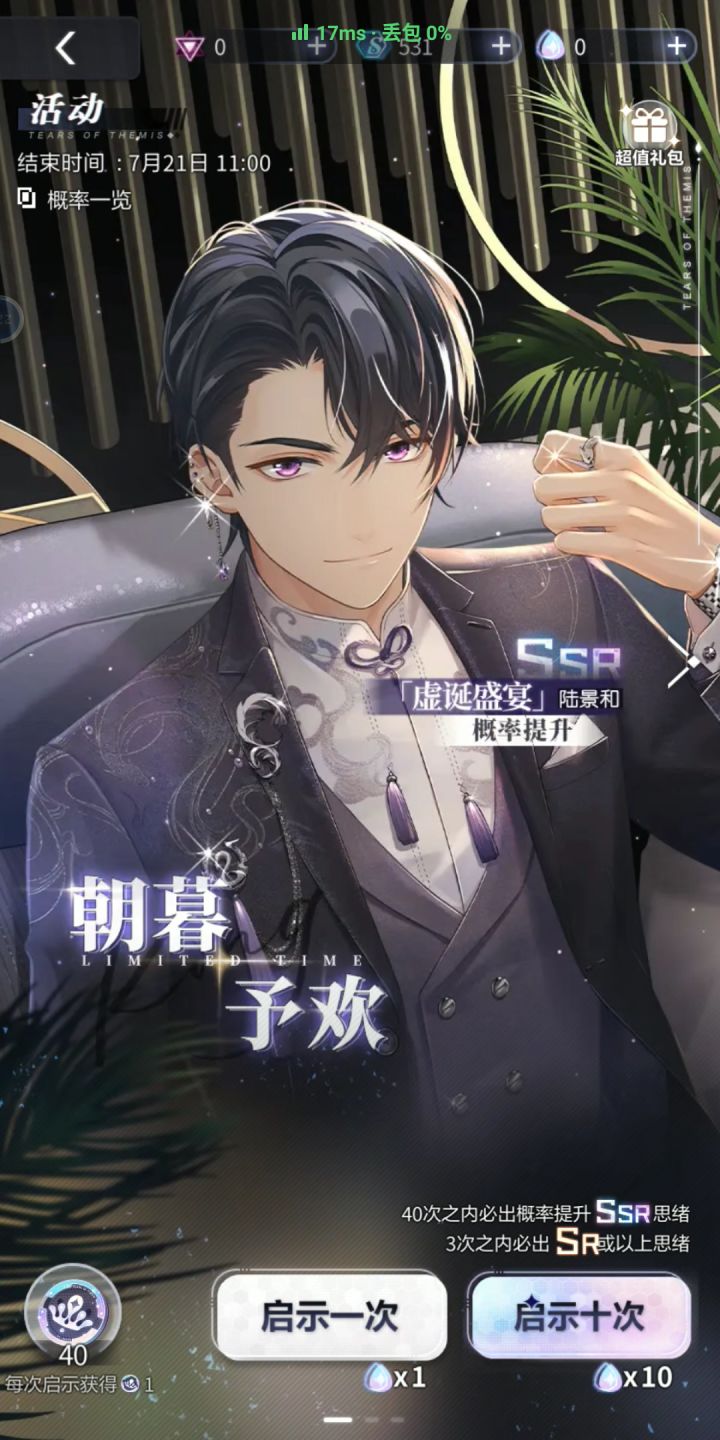 玩未定有个十来天了,什么时候才能抽到小陆总的ssr😭,明明对小陆总的心动比左夏莫都还要早,却一直抽不到小陆总的sr更别说ssr,这个唯一的小陆总sr还是今天才抽到😭真的好爱小陆总(虽然左莫夏都不错子但是真的好爱小陆总😭)