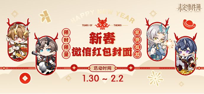 恭贺新春,喜气洋洋。2月9日-2月10日,《未定事件簿》新春专属微信红包封面免费发放! ✨新春专属微信红包封面大派送2月9日-2月10日,每日12:00将在《未定事件簿》官方微信公众号发放新春专属微信红包封面,共计四款(新春专属红包封面-夏彦款,新春专属红包封面-左然款,新春专属红包封面-莫弈款,新春专属红包封面-陆景和款)※每日每款限量发放10000份,两日共计80000份,发完即止※