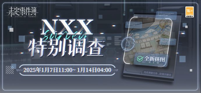 收集线索碎片,解开重重疑云,探索事件真相。1月7日,「NXX特别调查」限时活动开放! ✨「NXX特别调查」限时活动▶活动时间:2025年1月7日11:00-1月14日04:00一、完成主线第十六章,解锁线索调查进度获得章节拼图活动期间,完成「调查任务-最新进展」任务可获得【未名晶片】、线索、思绪升级素材等多样奖励。同时,律师获得的线索可解锁「线索调查」进度;当解锁进度到达100%时,即可