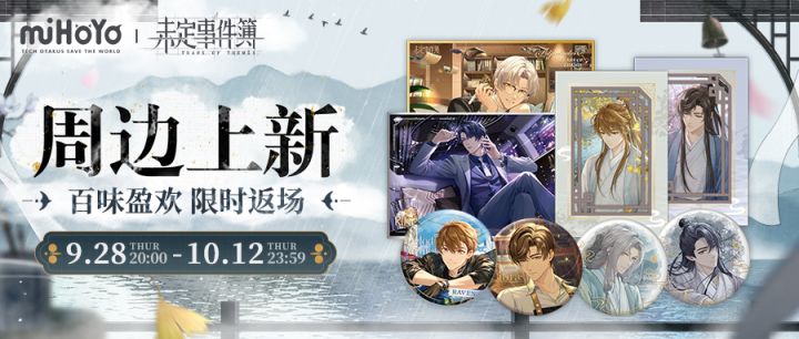《未定事件簿》多款周边即将在「miHoYo天猫旗舰店」、「米游社-未名商城」上新!※活动时间:2023年9月28日20:00-10月12日23:59 ✨多款新品限时预售-「与君聆珍意」系列马口铁徽章、亚克力旋转立牌、花窗色纸 古韵遗珍携手同游-「姗姗笺音」系列马口铁徽章、亚克力色纸、亚克力装饰画 时光漫漫纸短情长-「迢迢聆音」系列马口铁徽章、亚克力色纸、亚克力装饰画 清音流淌心跳共鸣-