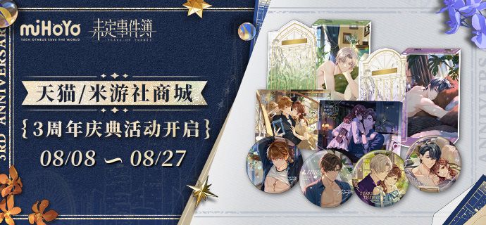 《未定事件簿》三周年庆典活动即将开启!多款新品即将在「miHoYo天猫旗舰店」、「米游社-未名商城」上架!※活动时间:2023年8月8日0:00-8月27日23:59 ✨多款新品周边开启限时预售-「归心之所」系列镭射徽章、亚克力色纸、亚克力挂件、Q版亚克力冰箱贴set、双人徽章、亚克力装饰画、马口铁徽章、亚克力立牌 旅帆归港心之所往 -「逸日偕心」系列马口铁徽章、亚克力色纸、亚克力装饰画