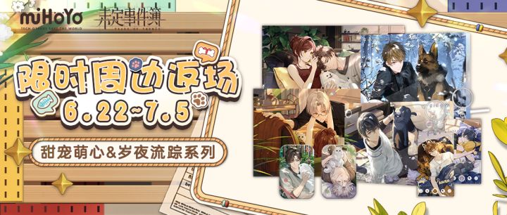 《未定事件簿》多款限时周边即将在「miHoYo天猫旗舰店」、「米游社-未名商城」返场!※活动时间:2023年6月22日00:00-7月5日23:59✨人气周边余量掉落-「甜宠萌心」系列 方形徽章、PP海报、亚克力挂件、装饰色纸、亚克力装饰画 风和日暖恋心萌动-「岁夜流踪」系列 马口铁徽章、亚克力装饰画、装饰色纸 盛夏蝉鸣重寻旧忆※「甜宠萌心」系列 方形徽章,「岁夜流踪」系列 马口铁徽章将