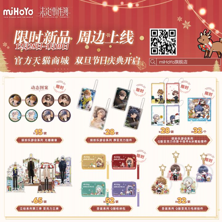 《未定事件簿》天猫商城双旦节日庆典即将开启!活动时间:2020年12月28日0:00-2021年1月10日23:59✨多款精美主题周边限时预售※预售时间:2020年12月28日0:00-2021年1月10日23:59-「缤纷乐游会」系列上新 光栅徽章、厚亚克力挂件、合影卡、冰箱贴铭记欢乐瞬间-圣诞系列Q版周边亮相 精美收纳包、可爱毛球挂件常伴身边✨立绘系列冬装立牌开启通贩-立绘系列第