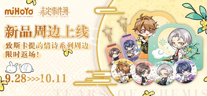 《未定事件簿》多款新品周边即将上架官方天猫商城!※活动时间:2021年9月28日0:00-10月11日23:59✨多款新品上架商城-皎月流光系列限时预售 Q版挂件、鼠标垫萌兔相伴共度佳期-午间茶歇系列限时预售 Q版马口铁徽章午后小憩尽享悠闲-珍藏系列纪念金属徽章第三弹上新 精美纹样铭记回忆※2021年9月28日0:00-10月11日23:59,致斯卡提的情诗系列、2021新年系列商品返