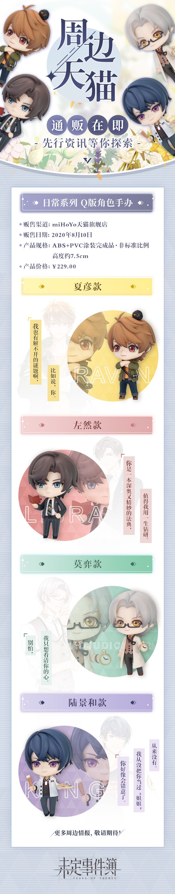 《未定事件簿》官方周边通贩即将开启——与他的未名之旅已然启程,从今往后,他会一直陪伴在你的身边。▌周边天猫通贩即将正式开启-开启时间:2020年8月10日-贩售渠道:miHoYo天猫旗舰店周边通贩正在紧张筹备中,贩售链接后续公开,敬请期待!▌Q版角色手办情报首次公开-什么都会,却对你这道谜题束手无策、心甘情愿的他-坚信正义,冷静理智,将温柔藏于无声行动中的他-神秘优雅,掌控全局却