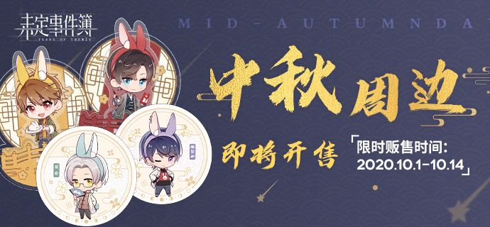 《未定事件簿》中秋系列周边即将开启限时预售!※预售时间:10月1日0:00-10月14日23:59▌中秋系列周边上新-Q版摇摇亚克力立牌 萌趣月兔贺中秋-Q版软木杯垫 原木材质传递他的温度详情请点击下方长图查看↓↓↓更多节日优惠、莫弈生日周边详情后续公开,敬请关注!——————————▌★联系我们:官方微博:@官方微信公众号:官方8群:官方10群: