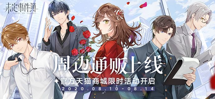 《未定事件簿》天猫商城七夕活动已开启!※活动时间:8月24日00:00-8月28日23:59▌清夏同游系列限时预售※预售时间:8月24日0:00-9月6日 23:59-清夏同游系列首次亮相 徽章套组、亚克力挂件即将解锁▌全新系列周边开启通贩-礼物系列Q版新款 软胶挂件、冰箱贴摆件萌趣上线-休闲系列加入通贩 布艺挂画、手机支架首次线上贩售-正装系列鼠标垫上架 你是我心动的唯一真相详
