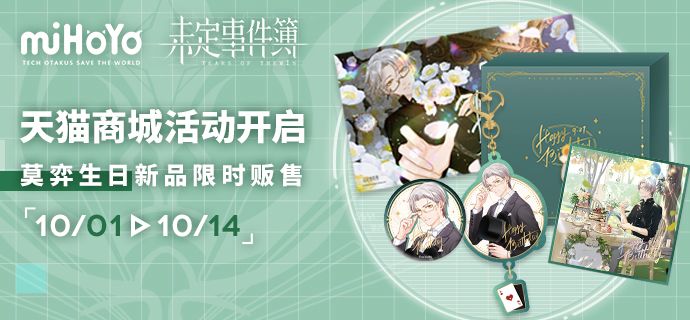 《未定事件簿》天猫商城已上线!公测庆典同日开启。※上线时间:8月10日0:00>>前往店铺:miHoYo旗舰店今后的点滴时光,有他相伴。▌多样新款周边 通贩即将开启-花语系列初次通贩 挂画、色纸、鼠标垫心动上线-立绘系列新品亮相 新版徽章、立牌即将解锁-甜点系列Q版抱枕 珍藏身旁有他的甜蜜回忆-踏青系列Q版挂件 阳光和煦与他相伴出行-定音系列装饰拼图 迷雾之后唯真唯你▌店铺公测