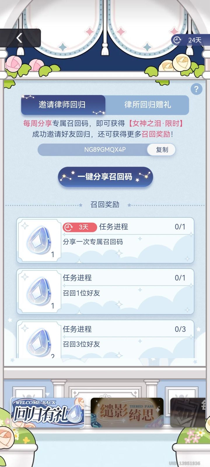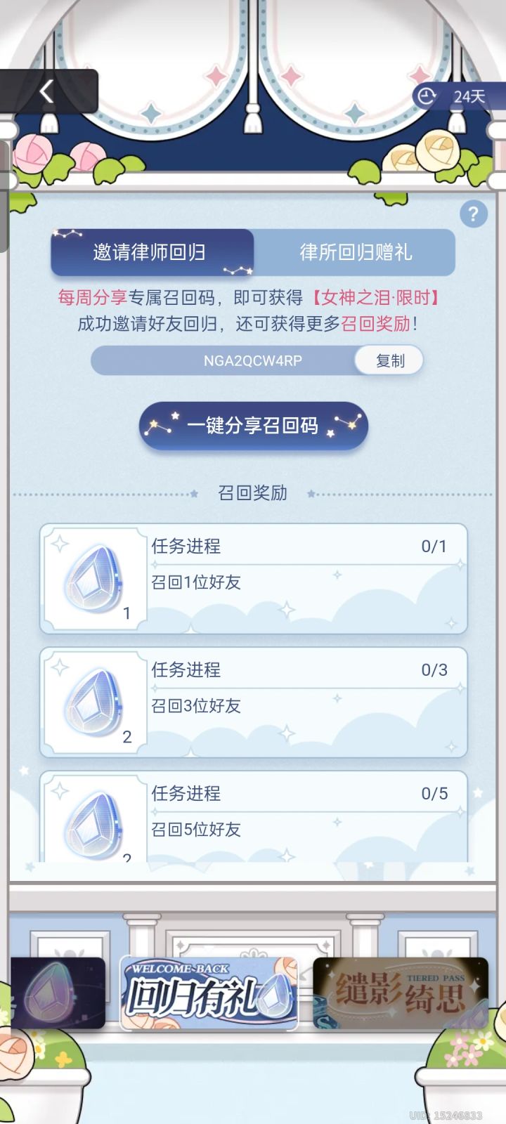 NGDBVA24GP,有没有回归的姐妹啊,可以填填我的召回码🥺