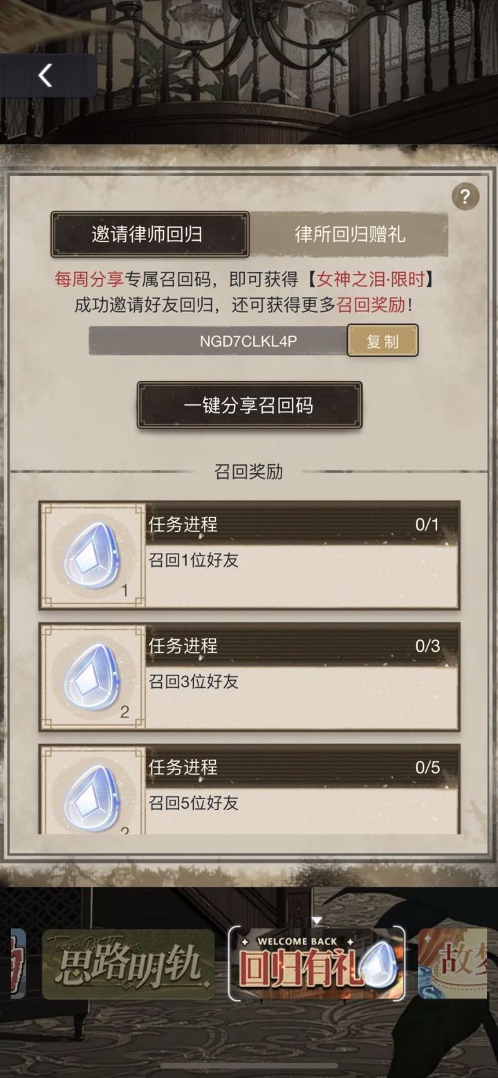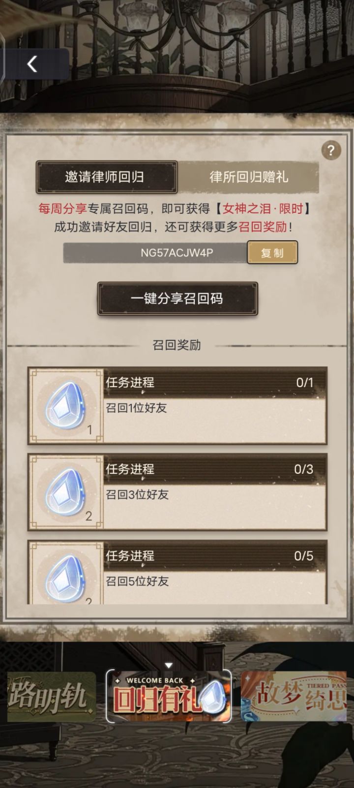 回归的姐妹看这里!召回码是绑定了双方都可以领的,真的很需要这几发泪😭,NG9ALRAZ4P,祝各位律师小姐新的一年也欧气满满😘😘