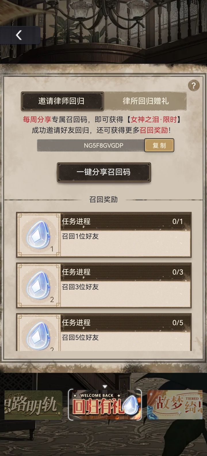 NGCFZWZXGP 回归的姐妹们可以帮忙填一下召回码吗😘😘