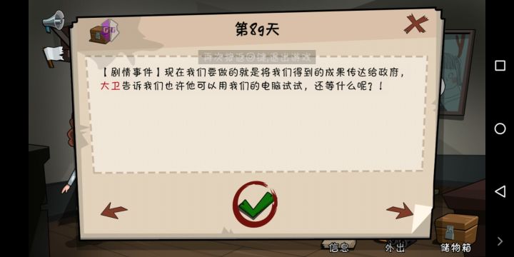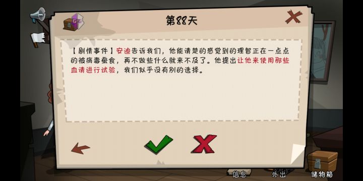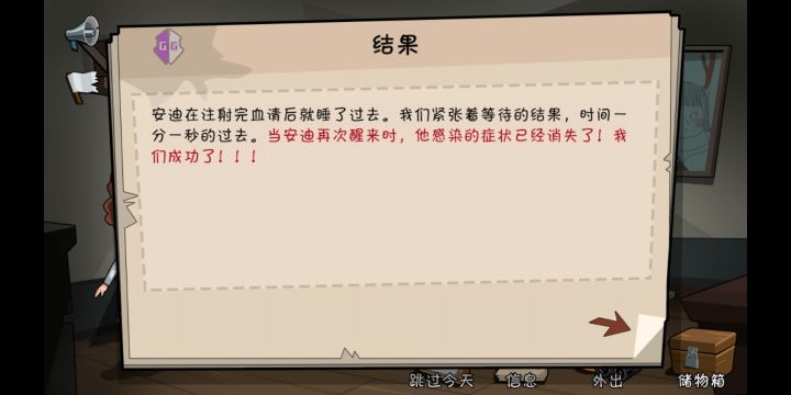 然后就是拥有:防毒面具和手枪的时候,去医院接女回来,让女带着防毒面具、指南针、一把武器进实验室,然后让老妈带着防毒面具、手枪、指南针进实验室,就可以获得病毒数据,妈回到家就会做出血清,让老豆不带防毒面具进实验室感染,回来后别让他走,第二天拿他做实验,就成了,然后让仔用电脑发送信息给政府,有人敲门就可以溜了。