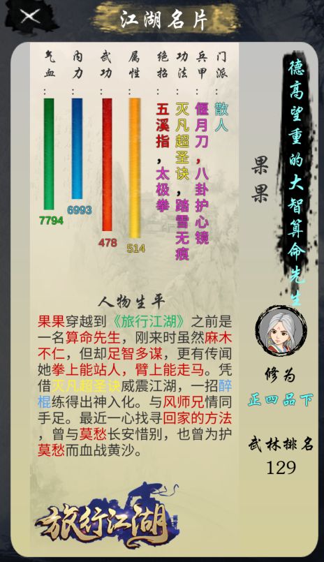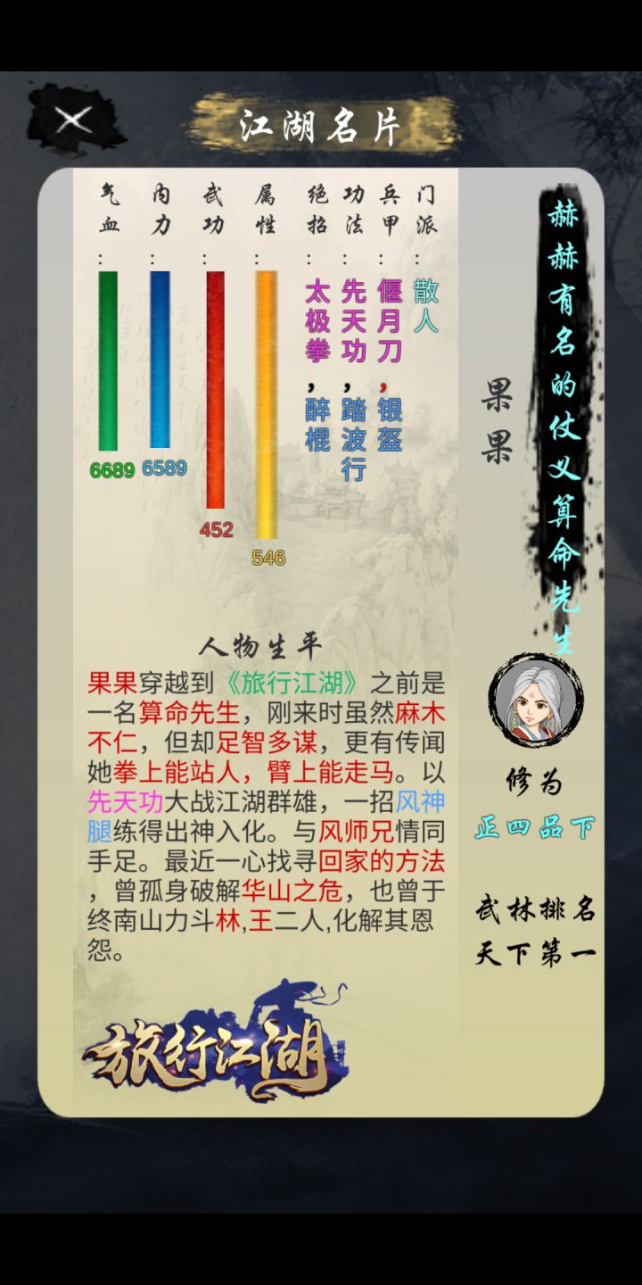 加入了QQ群,结识了一群江湖好汉,其中更有众多志同道合之人<散修,吾道不孤呀~ /欣慰>。经过1、2测后,发现【真·散修】则是寥寥无几~ 心碎........2测 【真 · 散修】 镇楼图!<因时间不足,武学大多未大乘境界,修为不值一提!>前世身份加成: 1,快递员(剑法+4,敏+4)2,卖菜大婶(剑法+8)3,算命先生(指腿+4,智+4)4,牙医(指腿+8)5,建筑工人(拳掌+4