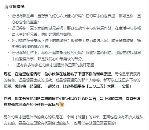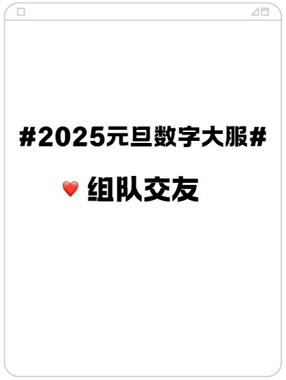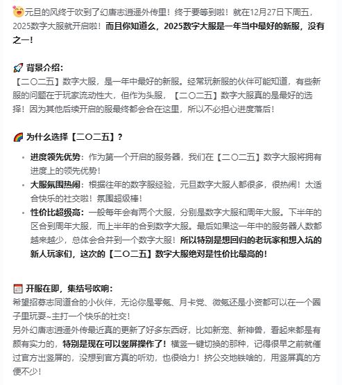终于明天2025元旦数字大服就开启了,已经和组队伙伴预创建好了,坐等明天!还想问一下有组队需求的朋友吗?新人和回归玩家都可以的这次的元旦数字服真的好值得入的!领先进度、人多热闹、情绪价值不用想也知道会很到位,性价比真的超高。已经准备和队友在幻唐志里面快乐的过元旦了!之前在战盟建的一个2025元旦数字大服的群里面也还有很多伙伴还在招募队友,有兴趣的伙伴可以冲!!