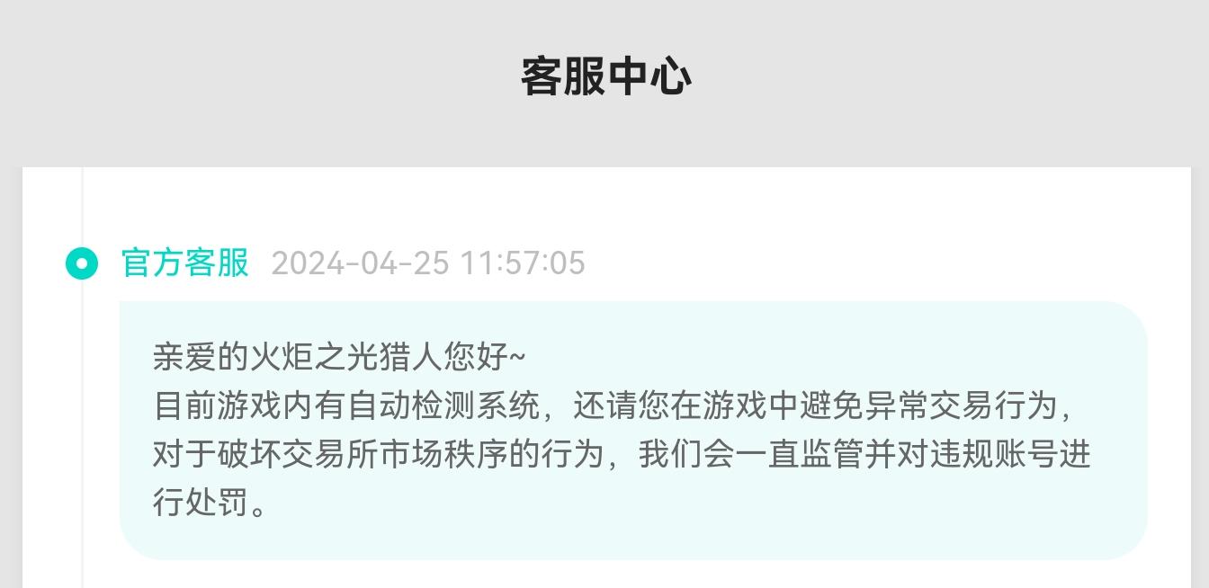 亲爱的火炬之光猎人您好:目前游戏内有自动检测系统,还请您在游戏中避免异常交易行为,对于破坏交易所市场秩序的行为,我们会一直监管并对违规账号进行处罚。你们检测到我和我的小伙伴在愉快的交易了吗?除了乱封,误杀。还能检测到啥?