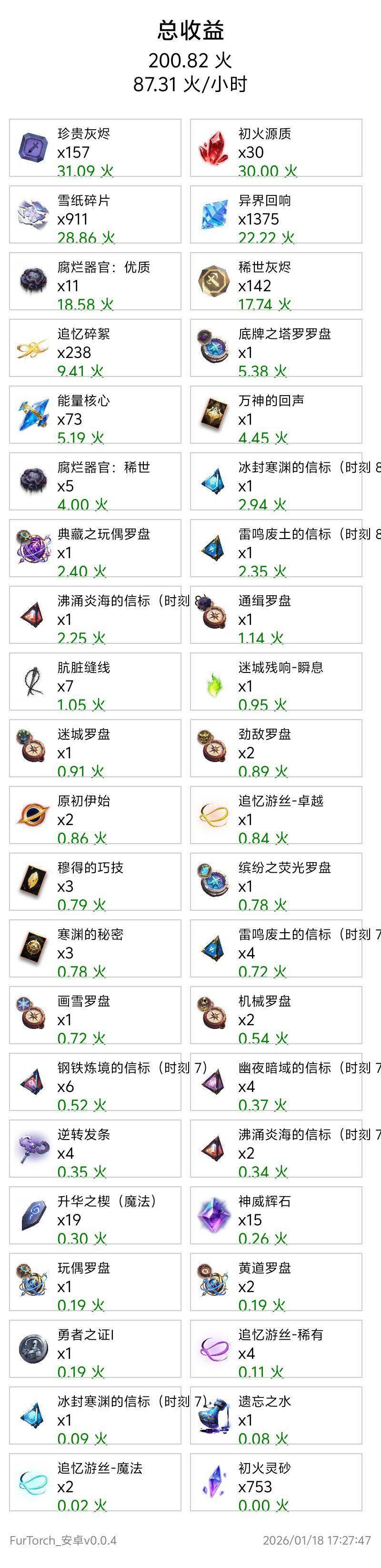 FurTorch 安卓统计器V0.0.5主帖链接:https://www.taptap.cn/moment/760540496614392477更新内容: 主页支持一键分享收益图片 支持国际服,可在主页切换 修复悬浮窗的一些问题 修复耗时计算有误的问题 修复 互联页面人数统计异常问题 修复日志界面行数获取异常的问题