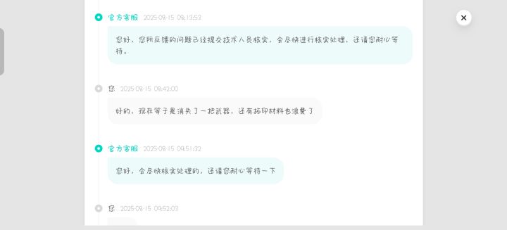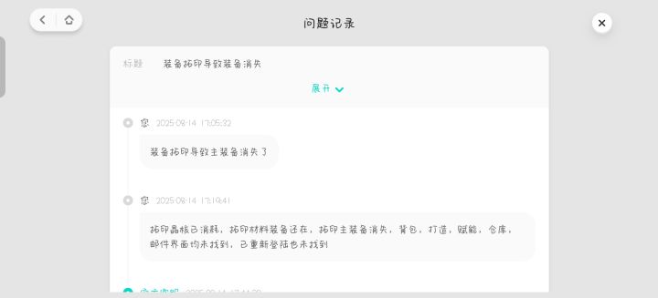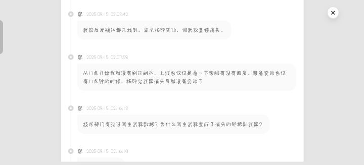8月14号下午5点装备拓印得球基底,结果武器直接消失了,此时装备栏主武器属性序列为夜谈,消失那一把序列为颠茄,在线联系客服,客服反馈拓印那个装备无异常,但是确实消失了,离谱的一幕来了,上线结果发现装备栏主武器转为消失的那一把,但原先主武器装备栏那一把序列为夜谈的,消失了,现在都快30个小时了,客服一直都是反馈说等待,难道不是时间越久数据越难找回吗?我想问一下大家有没有跟我一样遇到拓印基底装备消失的