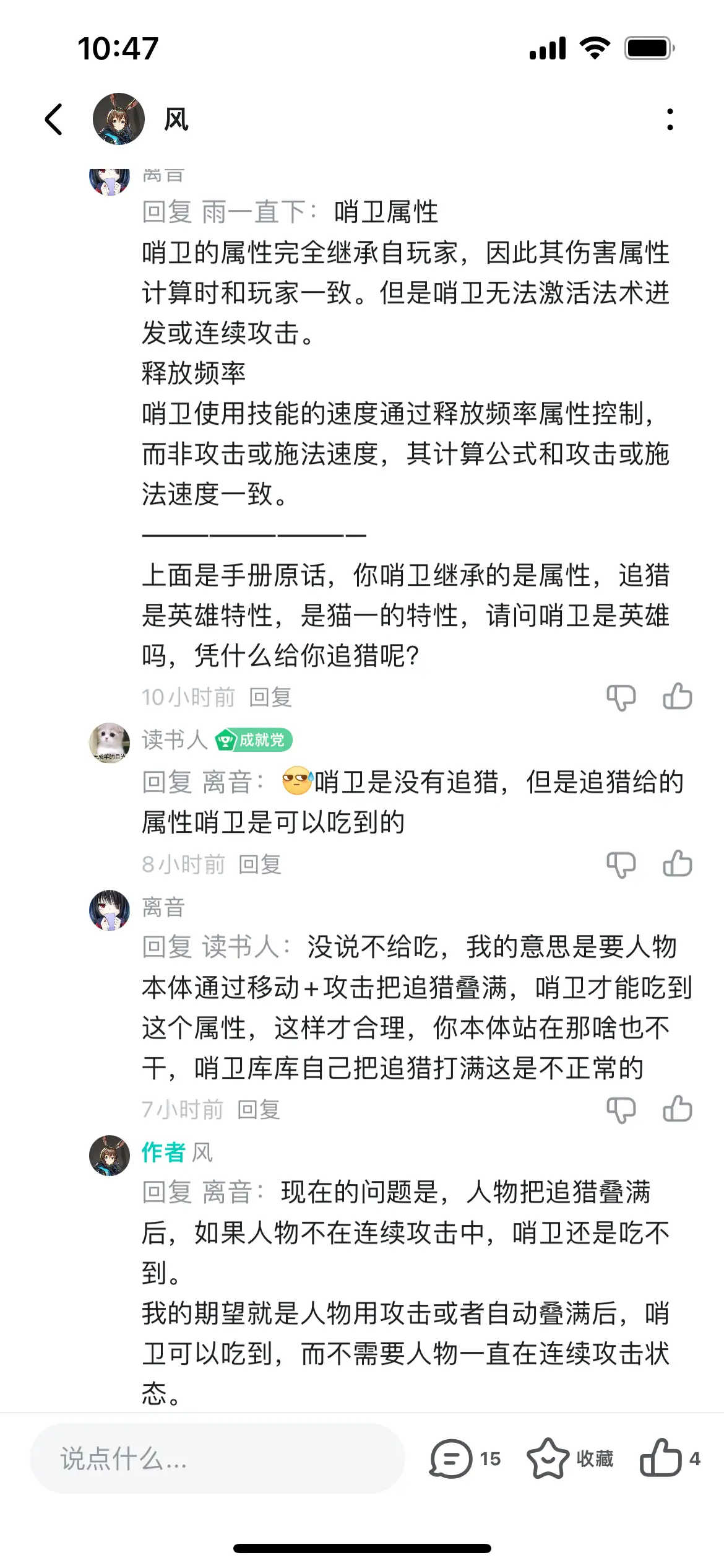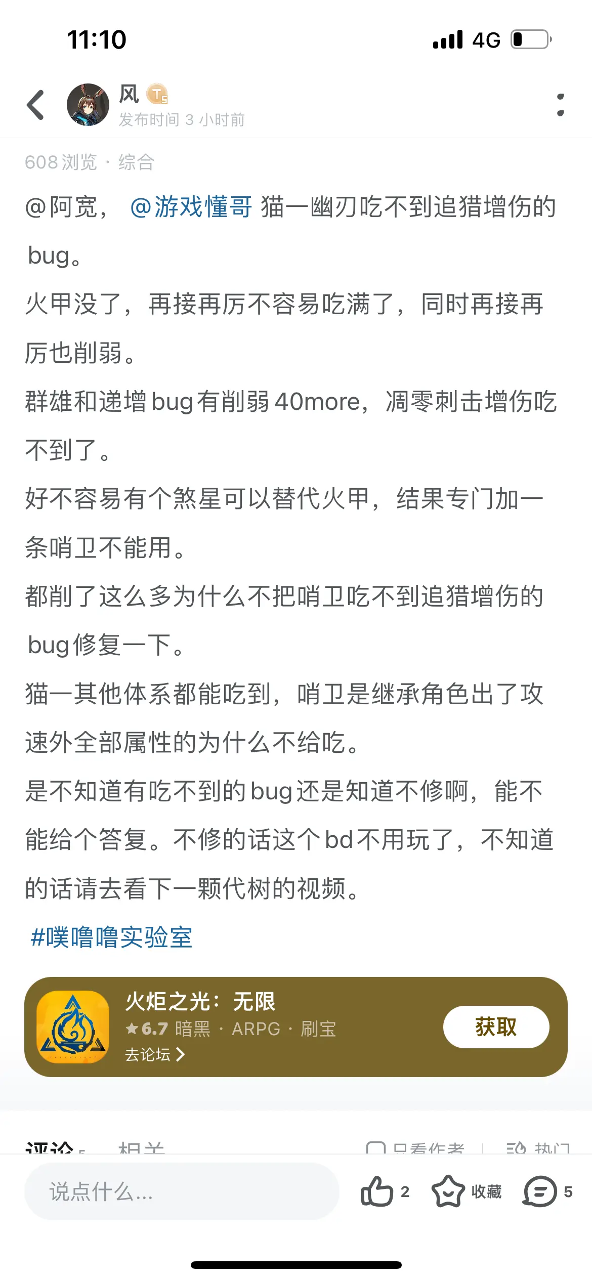 @阿宽,如题,现在猫一幽刃英灵需要缝一个戳戳才能吃到特性。导致这一条移速相关的特性即使推了移速,一样需要用螺旋击配合戳戳吃特性增伤。手都按出腱鞘炎了。如果能改掉那就可以放弃螺旋击让猫一跑起来了。伤害已经削弱这么多了,并且连续削弱几个赛季了,可不可以改成幽刃英灵能够直接触发追猎增伤啊。几个赛季前有问到你幽刃吃增伤的问题,当时回答我已经修复了,应该是我表述问题,其实是幽刃触发不了猫一连续攻击时的结