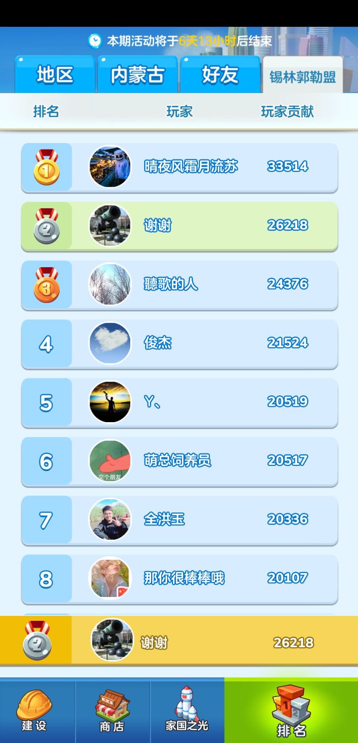 在朋友的无限次安利下,终于开始了建设家国大业没想到居然一次性肝了半个多月。现在接近毕业,也上了榜了,就此佛系开相册上图不知道有没有接触到第一梯队的尾巴。1.首先说一下大家最关注的红包问题,我是前期20,后期500。差不多到蓝色主要建筑5⭐之后开始转。后期20和100的靠供货完全够用。(憨憨之争)2.然后是关于贡献值 贡献值的来源其实就两个,一个拉货车,一个城市任务只要不是第一期的冲榜,