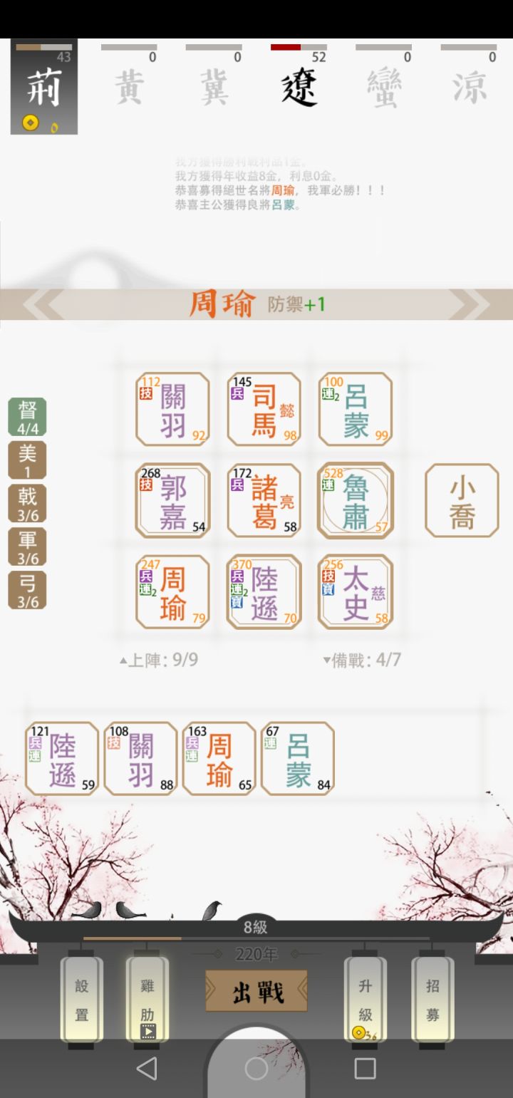 队伍里面配置两个戟,两个军师,一个弓…配合四都督,简直无敌…荆州比较容易,毕竟有钱成型快…