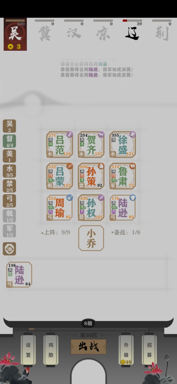 三水四都督加权策兄弟水师之强不必说,四都督中周瑜陆逊直接升箭雨,权策兄弟直接触发禁卫一级技能,而且还有孙权鲁肃吕蒙吴下阿蒙羁绊,并且九人间双人羁绊也不少第二种思路是五水师加四都督四都督帮五水师触发楼船,四都督内双弓手触发箭雨同样很强(仅仅是萌新的一点看法)