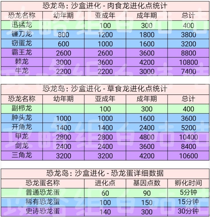 【内容】①所有肉食龙需要的进化点②所有草食龙需要的进化点③恐龙蛋孵化时间,孵化后获得的奖励