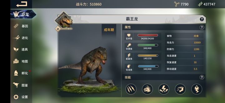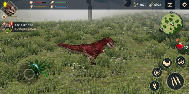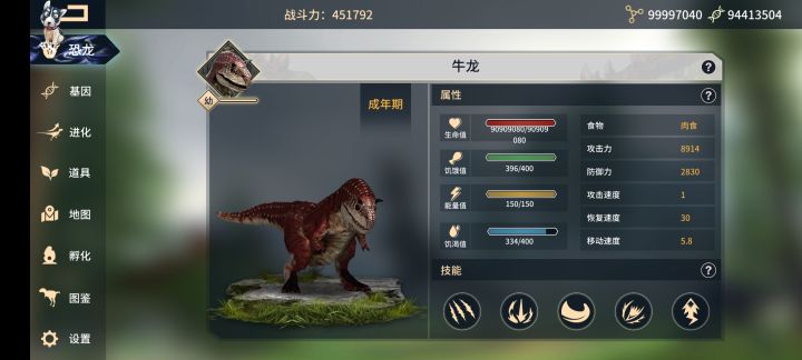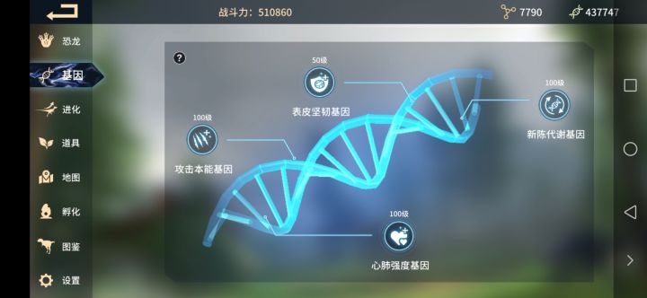 右下角那边全是食肉龙,我现在基因100级的霸王龙都干不过他们的大龙,右下角全是大型食肉龙,左下角是大型食草龙