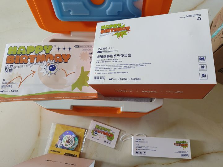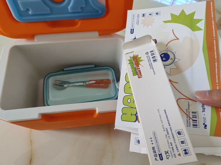 虽然已经看到了其他小伙伴说是保温箱&饭盒,拿到手还是很震撼,还另外送了一包贴纸~先看看贴纸包!三人组可爱捏!补个吊牌的特写,开始开(保温)箱!简约的设计只需要粗暴地掰开内容物&说明书~噗噜噜上大分,一个嗒啦啦都没有(哦,在旁边的标志里)说明书:饭盒&餐具的外包装这产地……经典从广东运出去再运回来保温箱挺大的,餐具和饭盒反而十分迷你(相对于我的饭量),这个叉子对我来说只能算是水果叉