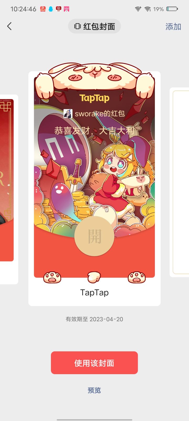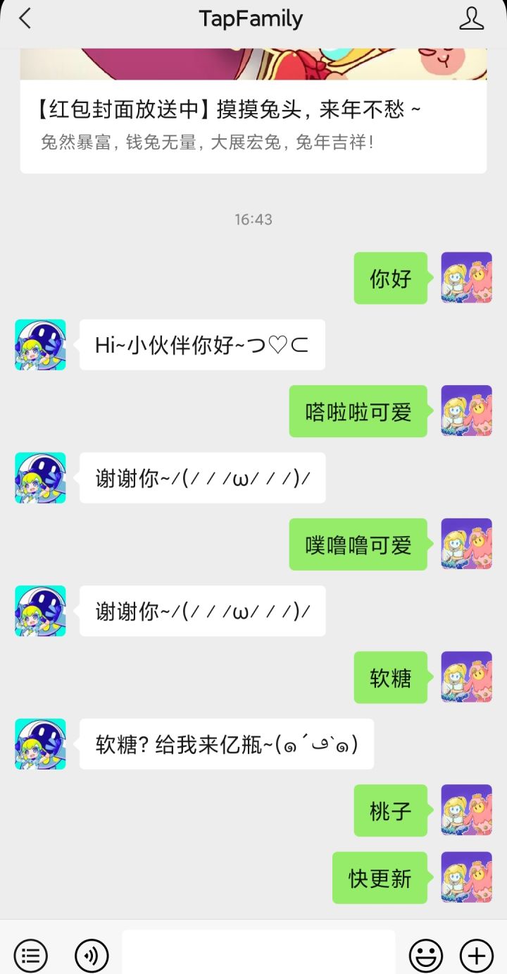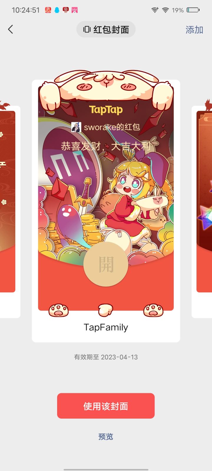 那么各位玩家,可可爱爱的嗒啦啦兔年微信红包封面之兔然暴富款今天由我来发布,为了避免忘记定时的玩家完全领不到的问题,将采用抽奖的方式,只要回复这个问题:如果你不得不住在一个电子游戏里,你会在哪个游戏的哪个城市安家?明天9:00开奖。*TapTap 发现好游戏的微信公众号也会在1月19日12:00、1月20日12:00发放一波《崩坏:星穹铁道》《鸣潮》《霓虹深渊:无限》等游戏的官方红包,欢迎来
