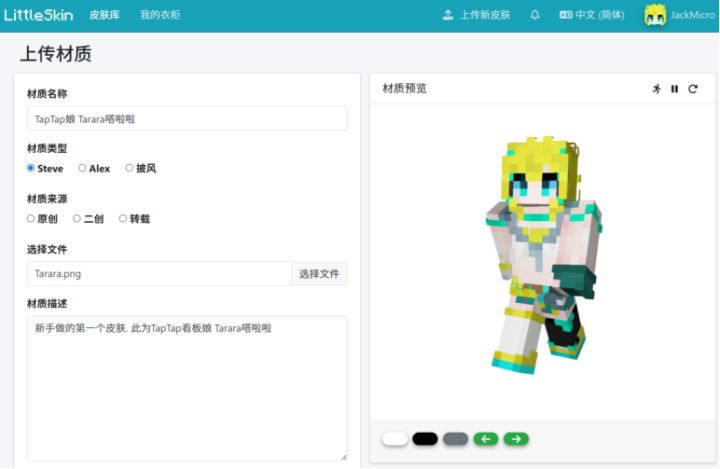 这可能是我的世界第一个Tarara皮肤???起因: 我在互联网上没有找到有关Tarara的Minecraft皮肤(这绝不可以! ), 所以 我 出手了. 过程: 1. 下一个专门制作Minecraft皮肤的简单软件__MCSkin3D2. 然后动手做皮肤 (当然肯定要参考其他皮肤来制作)3. 啪! 很快啊, 新手做的第一个皮肤, 完成了4. 皮肤已上传至 皮肤网站LittleSkin