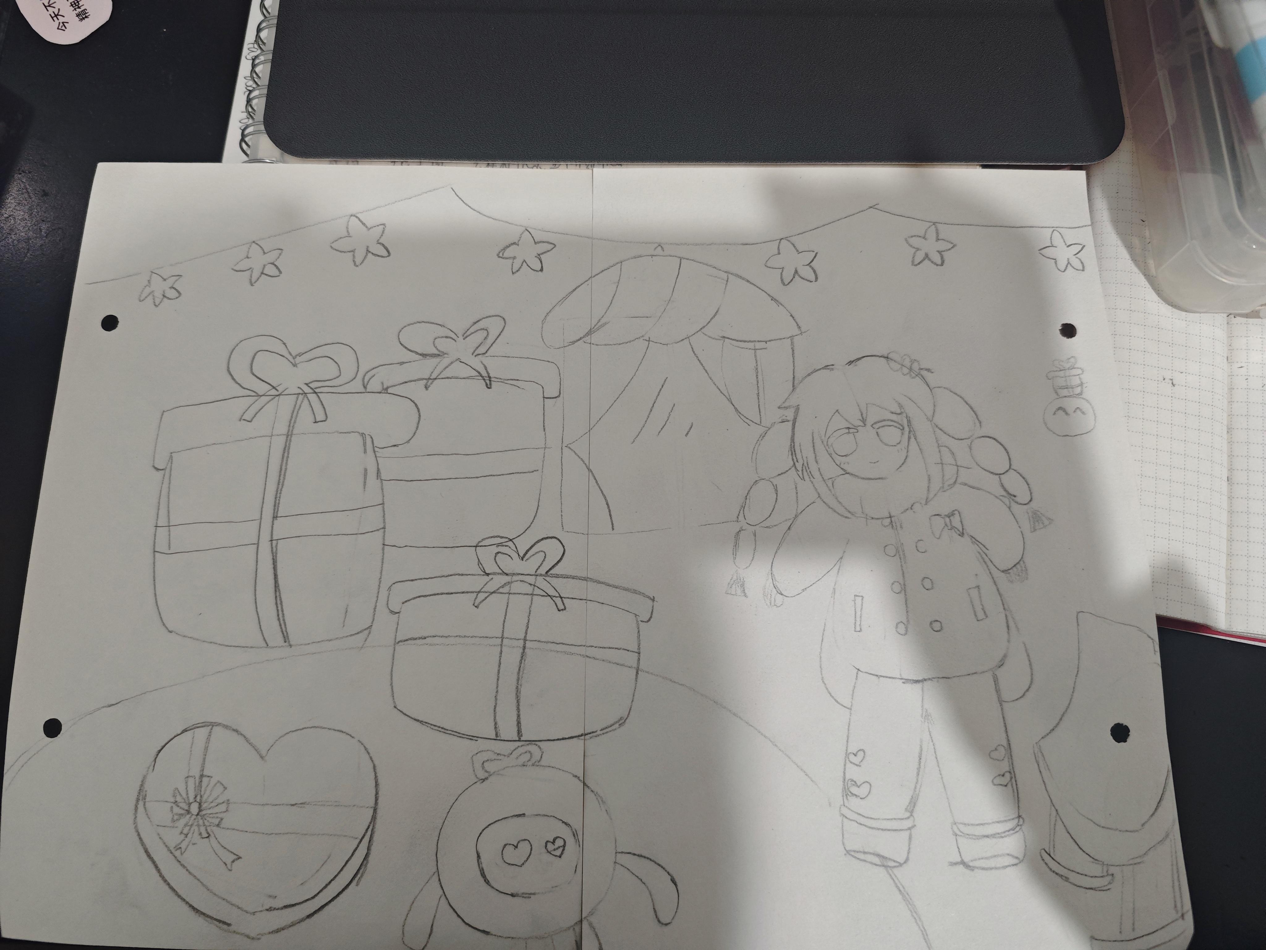前几天发现创作截止时间延长了,国庆一直忙着没时间还以为要错过,万万没想到可以再努力一下。昨天晚上刚好有空,想了想最近比较合适的主题,一开始想的是万圣节,后来觉得感恩节也很好就决定了主题是感恩。原本打算做从很多很多礼物堆在一起成礼物山的那种旁边加棵圣诞树,后来位置不太够,圣诞树就取消了 参考了礼物盒的款式,画了各种颜色和形状,主色调肯定是嗒啦啦绿。因为是手绘加上技术有限所以颜色搭配上和我想象的存