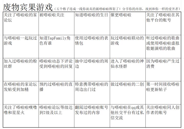 看到了明日方舟玩家做的废物宾果游戏(虽然不知道此系列图片是否在明日方舟起源但是确实以此为灵感设计)快来检测你是不是被嗒啦啦绑架了!我测完才发现我原来已经为嗒啦啦任劳任怨无偿打工两年半了!!!(被绑架了就别跑了嘿)