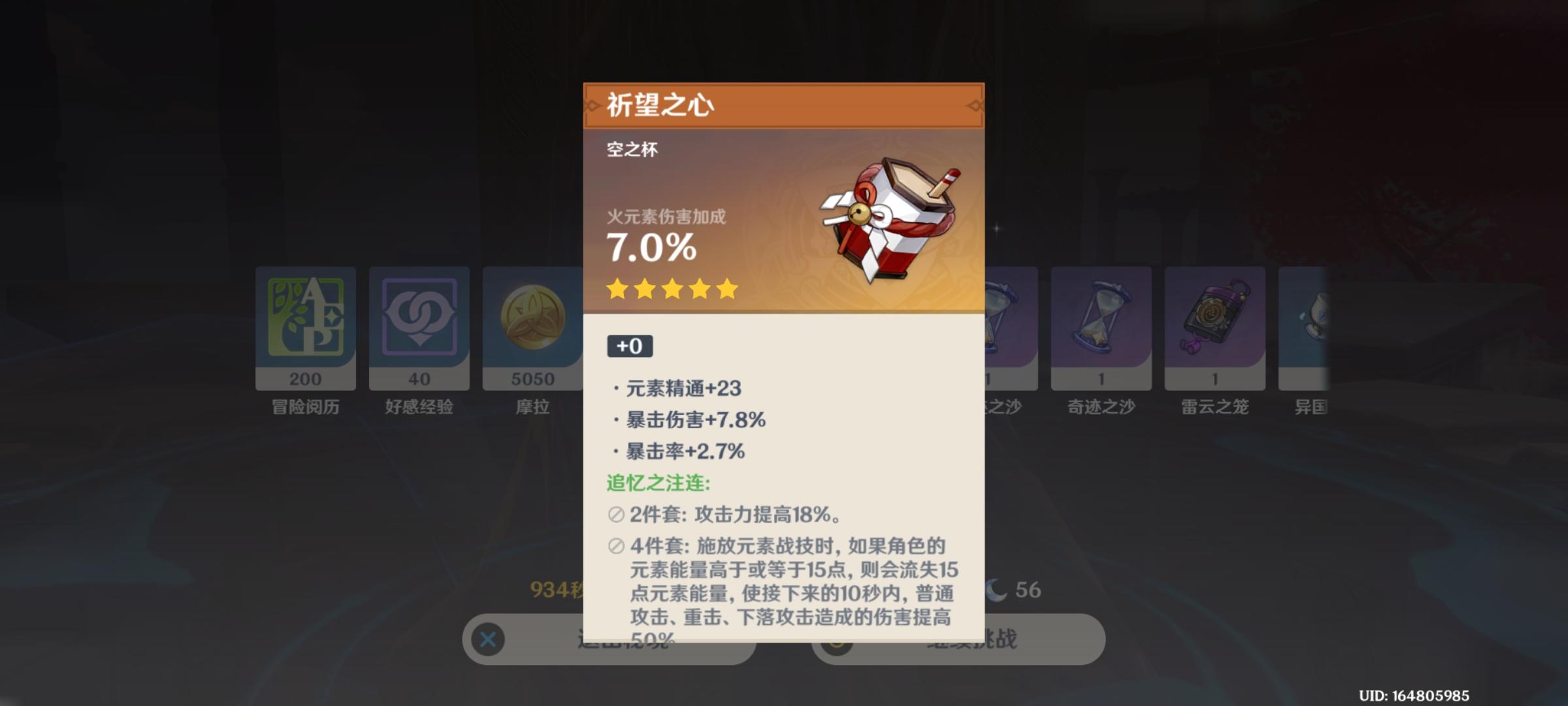 刚刚上米游社看到皮纳特更新了宵宫的攻略,于是立即上号给宵宫刷追忆套,第一次刷出了一个极品火杯(如下图),还有一个废物追忆羽毛,我激动坏了,连忙打开背包,火急火燎也没仔细看,抓起一个角标有“新”的追忆圣遗物就可劲升级,升到19级才感觉不对劲,我火伤杯呢?连忙退出来看了看圣遗物列表,靠,我给喂了。。。。这或许就是所谓大起大落吧,这一瞬间我真的,玩的欲望都没有了,突然就什么都不想干了
