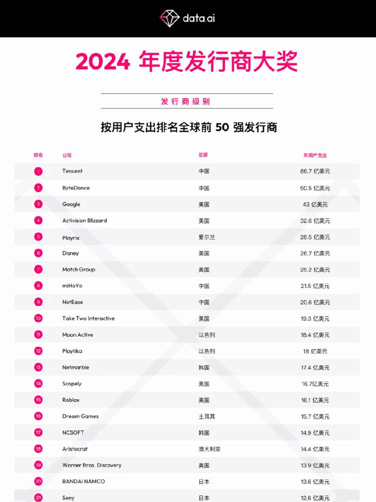 数据网站 data.ai 公布2024年全球发行商大奖,该榜单计算了2023年全球iOS和谷歌商店用户支出(不含国内安卓市场)。前五名分别由腾讯、字节跳动、谷歌、动视暴雪、Playrix占据。米哈游超越网易进入榜单第八。#今天游戏圈发生了啥#游戏资讯#吃瓜爆料#游戏讨论#国产游戏#米哈游