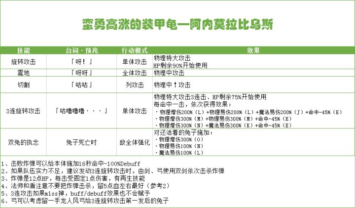 魔炮:机制比较复杂,有5段伤害,纯“物理”输出,会消除你身上的物理伤害buff,一般消除前4个都是伤害,第五个一般是特殊效果。