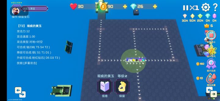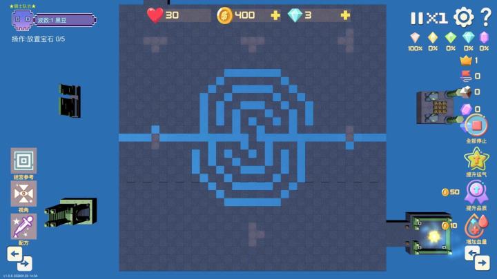 一、游戏模式1.新手模式:默认进来是新手模式,血量是正常模式的一半,到达30波即为通关。2.正常模式:只有通关新手模式,才可以开放正常模式。正常模式是无限关卡哦。二、基本玩法操作:挑战数波入侵者,血量逐波递增,难度不断加大。1.每波放置5颗随机宝石,放置结束后选择其中一颗留下,其他宝石将变为石头,可用作摆放迷宫。2.放置的5颗宝石中有2个相同的,则可以升级一个更高等级的宝石,如果出现4
