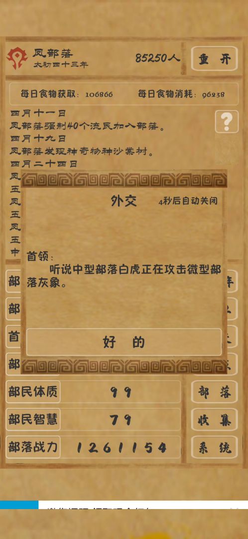 由于我升的是探索科技,后期有好多小部落,他们一打架我就玩不了了,我就卡在那一年了。关键是小部落一多,就算重启把刚才打架的部落灭了其他部落也会打起来。很烦,大半个小时就白玩了