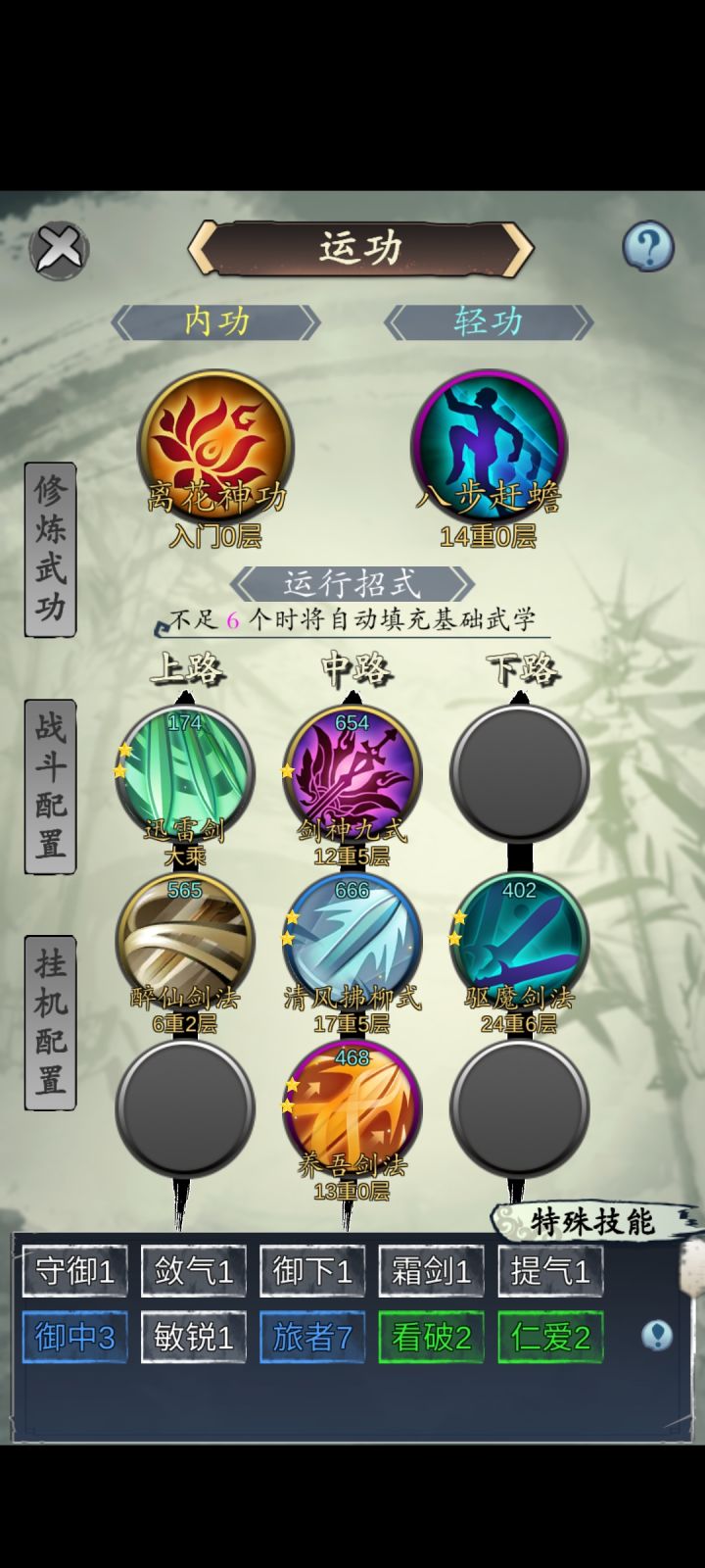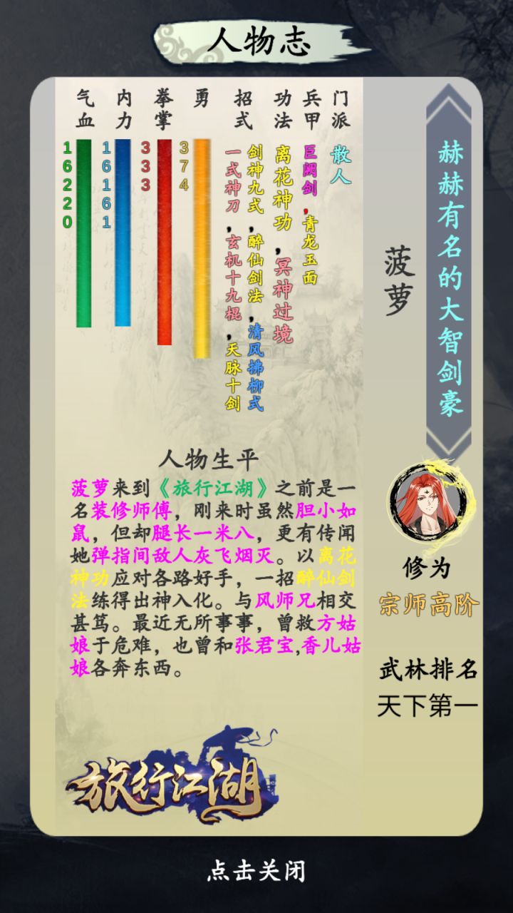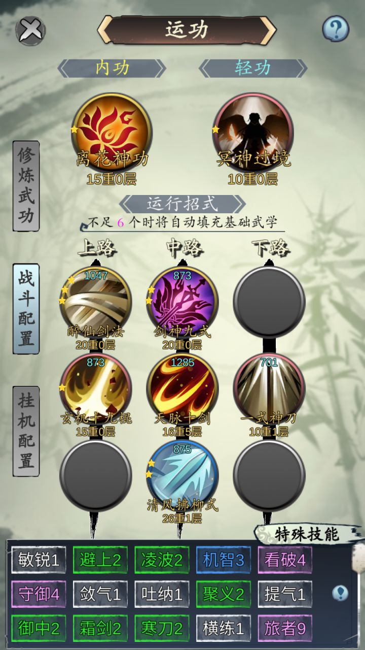 制作者:菠萝游戏内容东西较多,分几个章节写 需要的直接查询1.游戏的武功等级如何快速提升2.游戏的武功如何分别好坏3.内功用什么?为啥有的功法蓝很多血很少?4.装备用什么?怎么获取?卡槽是什么玩法?5.武功推荐1.游戏的武功等级如何快速提升游戏既然是叫旅行江湖,当然是跑的地方越多 挂机获得武功经验就越高。但是开新地图要声望,声望获取方式为普通旅行被杀猪吃高价饭等,逐渐闻名江湖。这