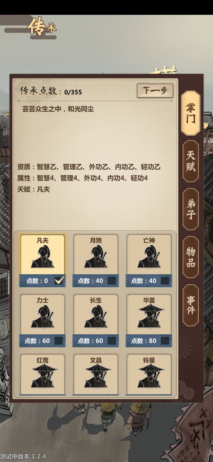 传承:怜星,三才,矿洞,力大无穷(主要是怜星和天赋那一排30传承点的,矿洞主要是门派发展用。)常规开局:外功,乐谱,工匠,卖江湖书或者开局20银或者领赏也行卯初:金捕头接买鞋任务黑衣人要鞋打架受伤的渔夫接任务得鱼山岭驴车接任务酒楼脚店小二赊账茶汤和饼,小二早点买清酒客栈客人给清酒更夫给茶汤(可以自己吃两个茶汤)作坊帮铁匠过时间卯正铁匠领取送剑任务金捕头给鞋抬高价格瓦舍帮