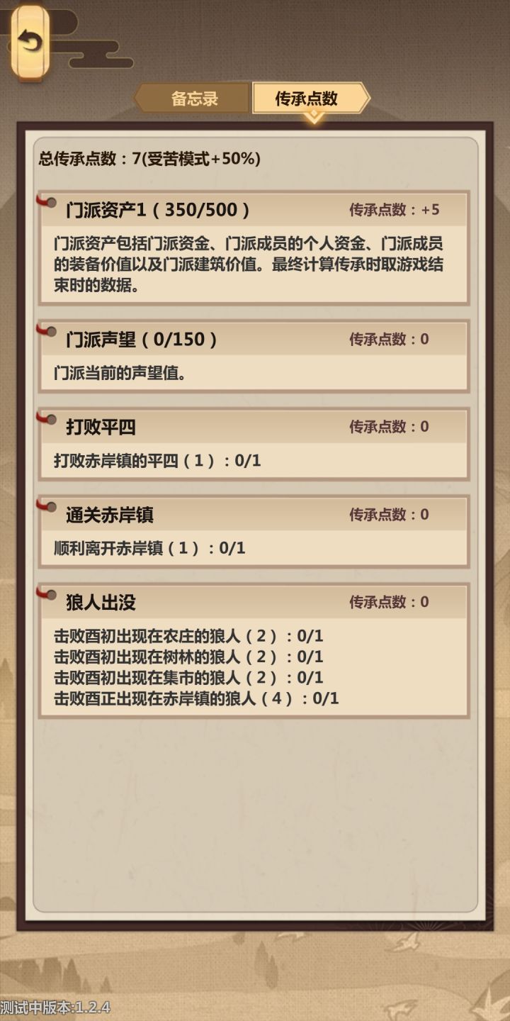 目前更新1.25,我把自己1.24的攻略发个大家看一看,欢迎斧正。最终目标:幸运46,体力100,魅力25。1.开局篇简配模式开局华盖(80)外+内+轻(90)幸运(40)矿洞(40)这样最低模式250就可以开启,一般人二转以后很轻松,我二转是300,这样可以选一个小张少爷(门派前期会有点帮助,门派篇我会讲到),如果不够50又多传承点,推荐买+2智力玉佩。然后重点来了,必要经书+