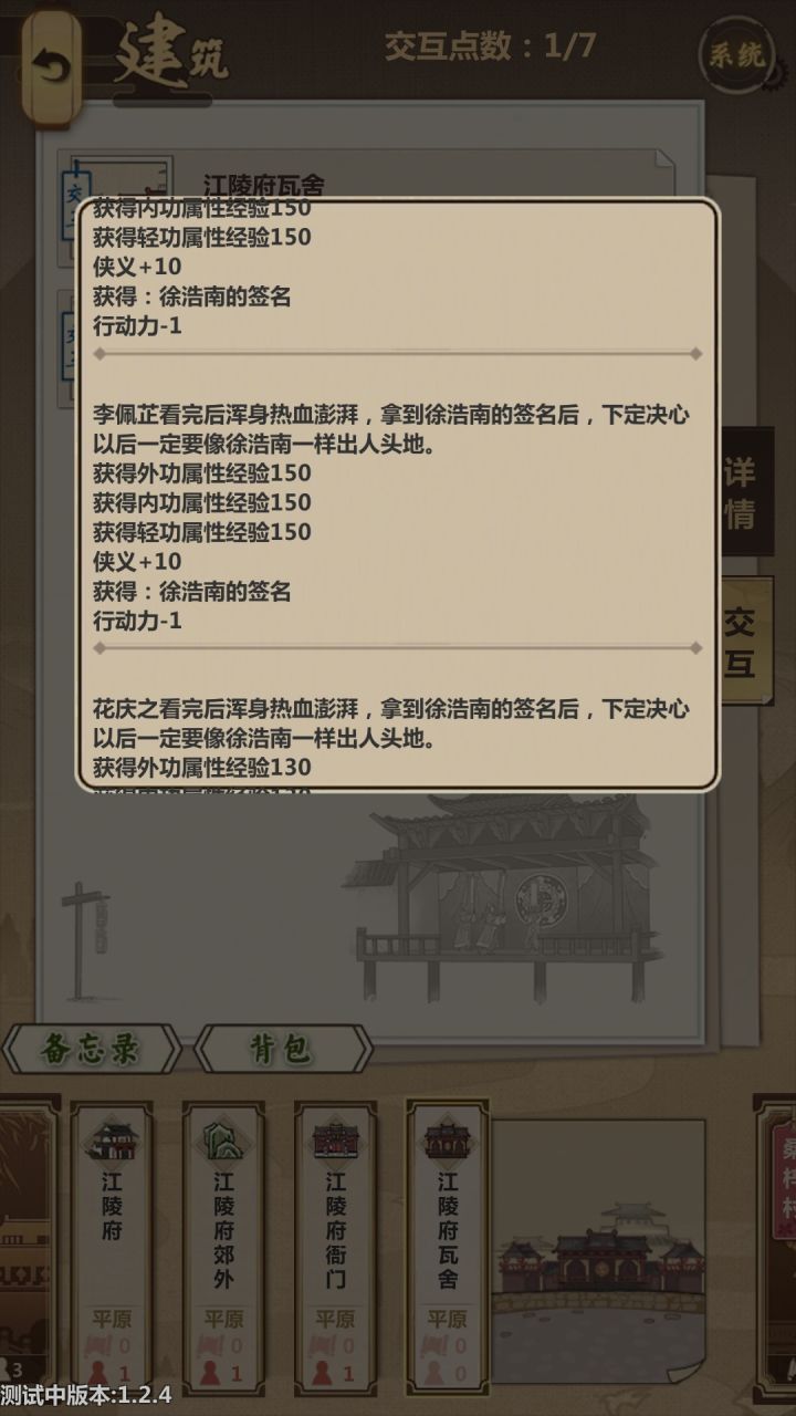 一个刷钱的bug我也是在sl行侠的时候意外发现的这个bug。应该是在做完叛徒吴章的任务之后,保存之后进入行侠,然后再读取存档。会发现吴章的远行可以重新做了。这样的话可以不停刷那200两银子。注意!!!!!用这个bug之前,也就是接到吴章任务之前,先让你的侠客多回复点行动力,因为做任务消耗的行动力是无法回复的。所以,你能打败吴章的侠客总共有多少行动力×160就是你能刷的钱数大家可以试试,