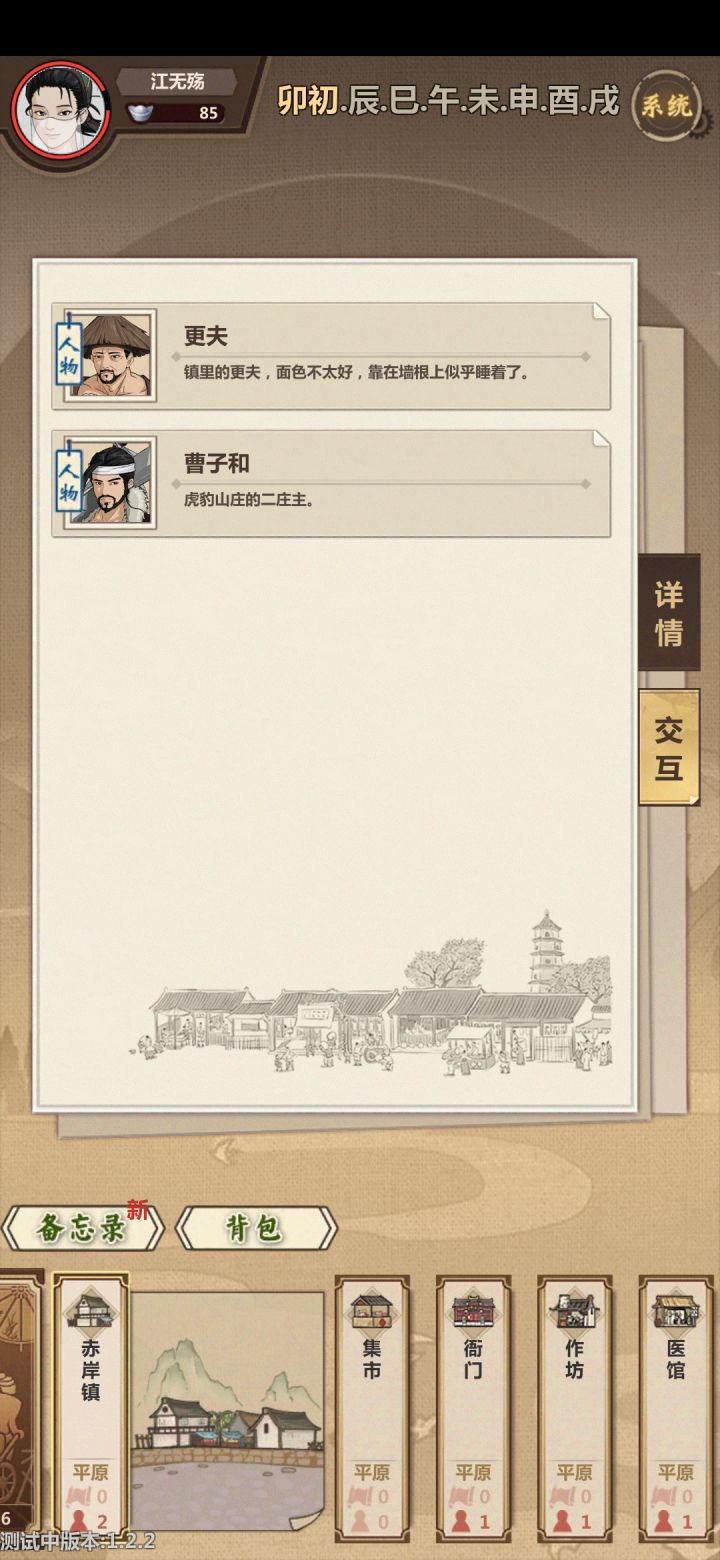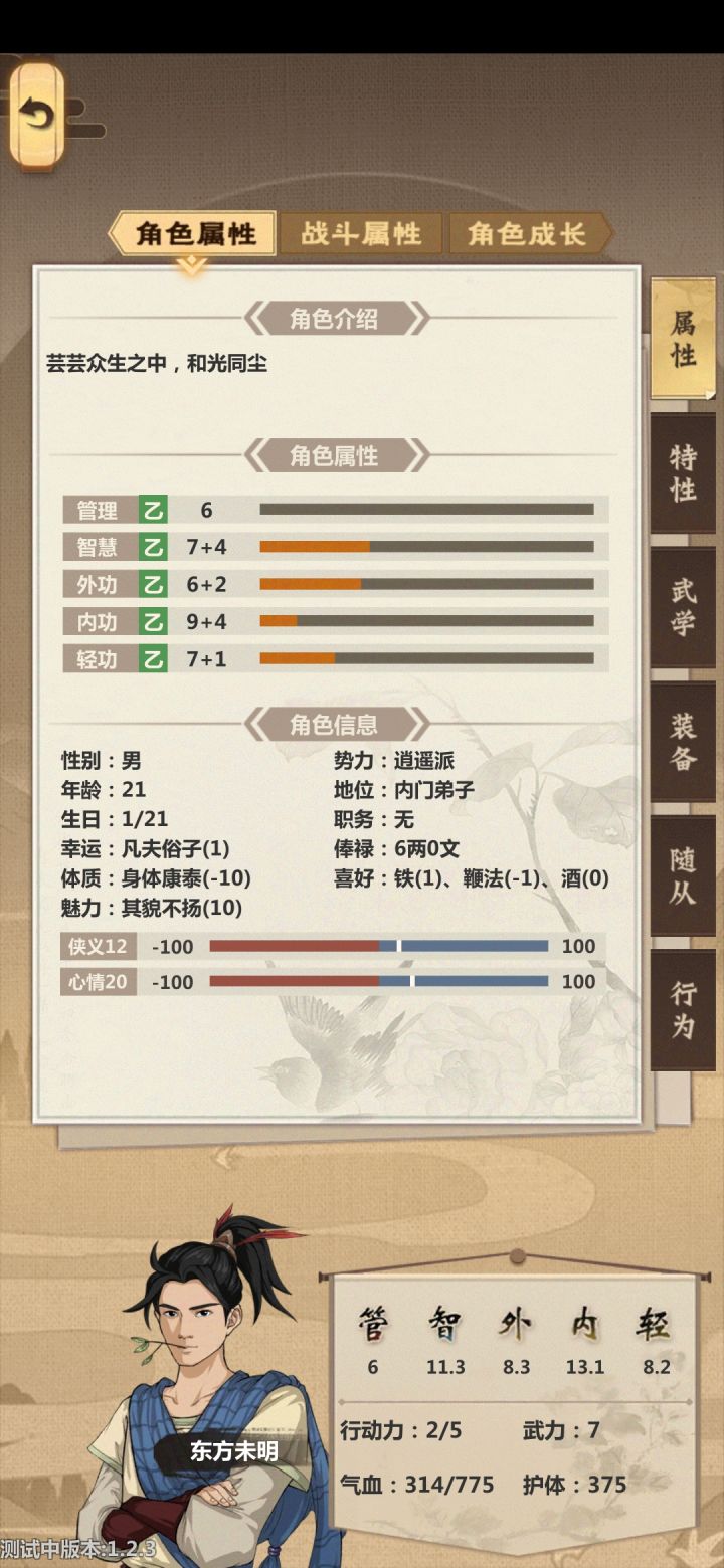 又是新手村的攻略以1.2.0版本参考,开局选择天赋苦命儿,独眼,强壮,物品拿木盾。开局比须刷到捡到钱和得了狼皮的或者打了贼的经历,头像内行为栏里可见,开局练武,外功,谱曲,工匠,想知道如何得随从的就别了,去了门派就没了开局事件总结开局概率得到的装备,得自己装上去。有捡到钱的,有预订了刀要到铁匠那领的,得装备扇子的,开局得装备玉佩的,有开局得装备冬衣的,有加心情的,有减心情的,有加运气的,有