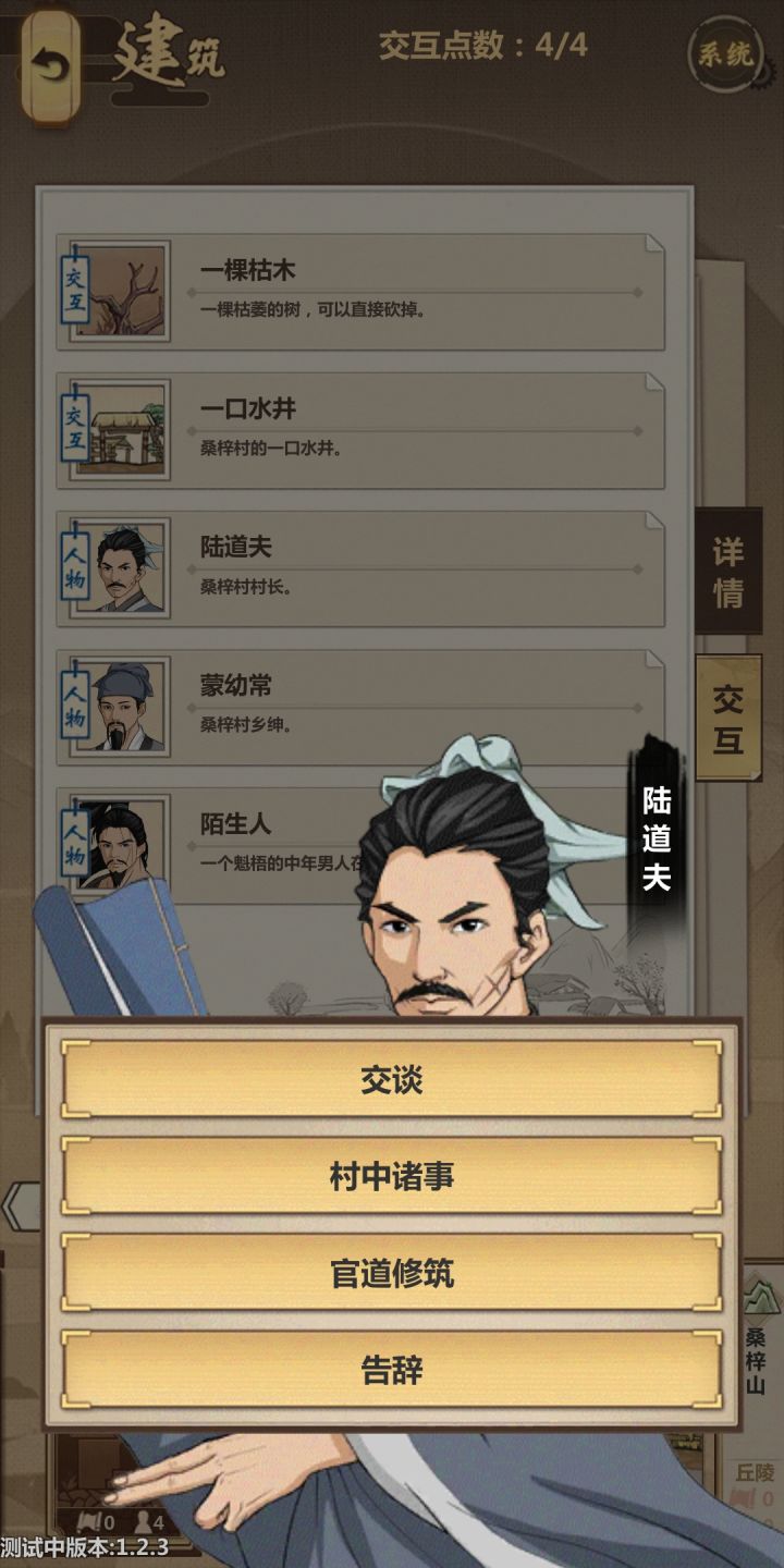 凡夫出门选苦命天赋,物品消耗品里面兑换门派宝箱,目的是为了到门派时能拿甘草制作行动力5的丹药,能在前期开后山获取大量金钱和声望。这是我抵达门派后的金钱,选上路中间可以采集得到玄铁矿后续可以打造一把玄铁剑!运气好可以得甘草就再多一颗润体丹。刷出炼药师,直接制作润体丹一枚,酒店厨师我给他羊葱绿麦他也只给我蓝色饼干!血亏20金。建筑不着急升级,下来先开地图,拿人情保证一会打劫不会被抓,然后兑换交子开