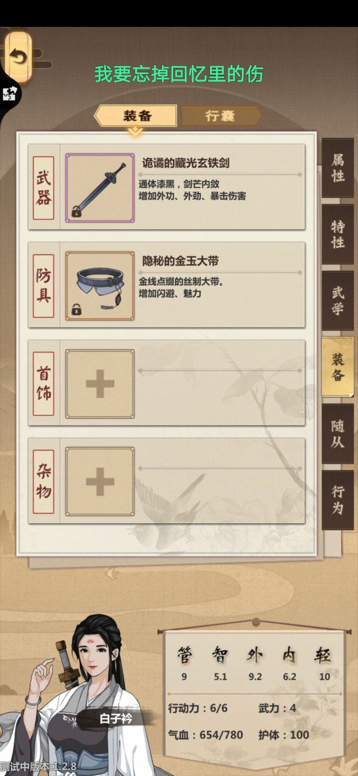 肝了几天,也谈谈我的一点小心得。这个游戏,最单纯的乐趣就是刷新手村…出了新手村以后,玩法瞬间改变,似乎换了个游戏。不过以我看来,新手村基本已经固定不会再有大的改动。门派里很多玩法都别出心裁很有意思,但是大多都没放出后续,不知道是没做完还是不愿放出,非常可惜。新手村开局有很多种,有金钱至上的,有武功经验至上的。我自己趋向于对后续门派帮助最大化的开局。都是基于0传承的基础。有几点取舍。开局人