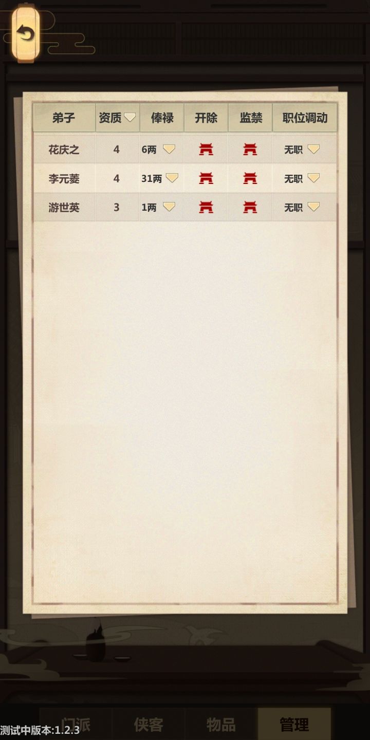 看完点赞顶我上去!Tip:好感到100就不会掉了首先!第一旬和师叔切磋,和师姐交谈!钗子新手村准备好,酒行侠下路拿然后灵魂步骤来了!点开管理→弟子管理把俸禄拉高这里的心情和忠诚是即时计算的,但俸禄是每旬结算的!反复拉到150%→确认可以直接好感50+最后过河拆桥(反正忠诚没用了)官方看到了赶紧修复,乘官方还没看到赶紧学着点!丁阳也能如法炮制!腾出来的交互点可以用来摸祖坟!记得
