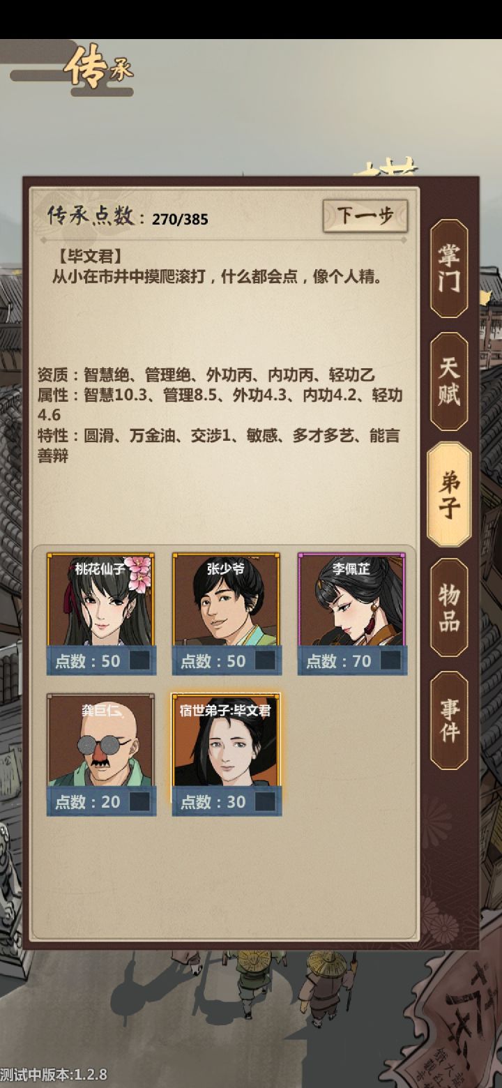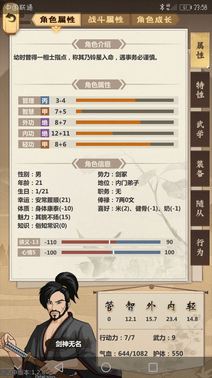 我的猜测:魅力能在门派招人时招到副职等级更高的人物能减少大量sl的时间运气能增加建筑升级后好特性的概率能增加暴击概率,真心希望也能增加暴击伤害平A护体暴击流(攻速加成太低了不划算)会出现1.武学是叠护体的,比如三才+道家装备是加暴击几率和暴击伤害的2.技能是加暴击的和暴击伤害的(师兄给的枪法)装备是叠甲的第一个是稳妥的第二个是暴力的体质能减少抗药性和各种被控制的概率抗